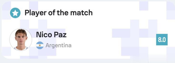 尼科・帕斯凭借第 32 分钟的精彩任意球和全场稳定发挥,收获8.0 分的全场最高评分,当选本场最佳球员。这位卡斯蒂利亚青训出身的前皇马球员,本赛季在科莫队表现出色,仍是阿根廷世界杯 26 人大名单的有力竞争者。