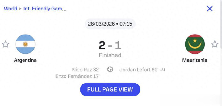 北京时间 3 月 28 日(当地时间 3 月 27 日),世界杯与南美双料冠军阿根廷在布宜诺斯艾利斯糖果盒球场迎来世界杯备战热身赛,最终以 2-1 的比分击败世界排名第 115 位的毛里塔尼亚。恩佐・费尔南德斯与尼科・帕斯在上半场先后建功,后者一记精彩绝伦的任意球破门不仅打动梅西,更以 8.0 的全场最高评分荣膺本场最佳球员。